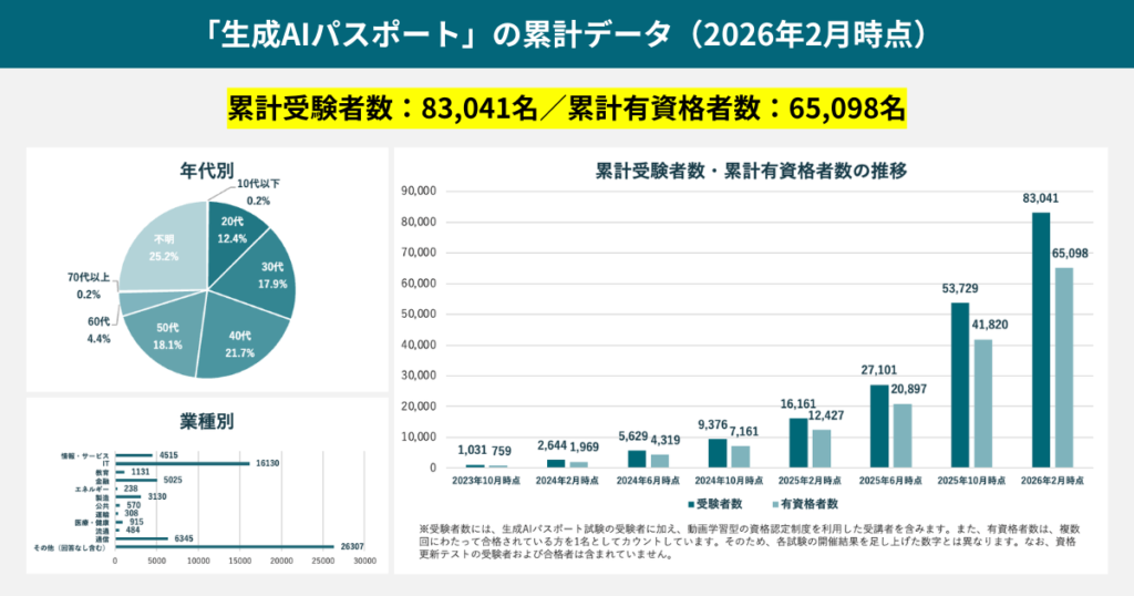 2026年2月1日(日)〜2月28日(土)に開催した「2026年2月 生成AIパスポート試験」の受験者数は28,415名、そのうち合格者数は22,401名、合格率は78.84%という結果になりました。また、2026年2月時点の生成AIパスポートの累計受験者数は83,041名、累計有資格者数は65,098名になりました。